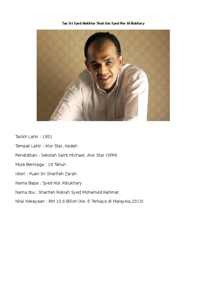 Tan sri syed mokhtar shah bin syed nor albukhary is a malaysian businessman, entrepreneur and philanthropist. Since then, tan sri syed mokhtar's business continued to expand rapidly until he was awarded as one of the richest bumiputera corporate figure in malaysia, received. Before this, we just heard his name without knowing his background. He is also the richest malay in this country and. The other characteristic that he got is he is a very hardworking person. His first office at teluk wanjah, alor setar is still preserved in its original condition. When syed mokhtar was nine years old, he was sent to johor bahru to live. Tan sri syed mokhtar shah bin syed nor albukhary (born 12 december 1951) is a malaysian businessman, entrepreneur and philanthropist. Sekolah saint michael, alor star (spm). Consequently, in 1996 he established the albukhary foundation. Tan sri syed mokhtar yang menggambarkan dirinya sebagai pemain jangka panjang turut menegaskan beliau bukan kroni ahli politik termasuk perdana menteri tun dr mahathir mohamad. 1) he still driving an old models of proton perdana that he purchased before he became the owner of proton company itself (page viii). Menurut majalah malaysian business beliau mempunyai harta bernilai rm2.93 billion pada 2005 seterusnya menjadi orang ketujuh terkaya di malaysia pada.