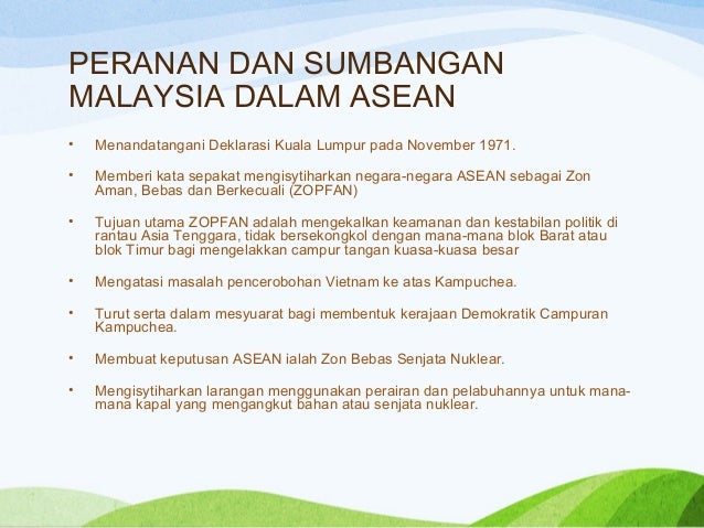 Peranan dan sumbangan malaysia sebagai anggota asean • menandatangani deklerasi kuala lumpur pada november 1971. Tetapi, tidak hanya keduanya, beberapa negara seperti indonesia, malaysia, dan singapura juga berperan sebagai penyedia cadangan makanan darurat. Kesimpulan peranan dan sumbangan malaysia dalam asean dapat dilihat sebagai asas yang kuat dalam menjalin kerjasama serantau.jika dilihat dari awal penubuhannya hingga kini, banyak rancangan yang berjaya dilaksanakan demi kebaikan bersama. Pengajian malaysia bab 5 ( peranan asean,oic. Peran indonesia dalam asean (association of south east asian nation).